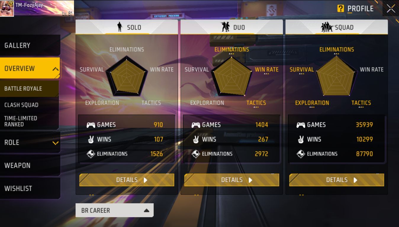 FozyAjay ने 35939 स्क्वाड मैचों में हिस्सा लेते हुए 10299 में जीत हासिल की है। वो 87790 किल्स कर चुके हैं और उनका K/D रेश्यो 3.42 का है। इस यूट्यूबर ने 1404 डुओ मैचों में हिस्सा लेते हुए 267 मैच जीते हैं। वो यहां 2972 एलिमिनेशन कर चुके हैं और उनका K/D रेश्यो 2.61 का है। सोलो मोड में Ajay ने 910 मैच खेलते हुए 107 जीते हैं। उनका K/D रेश्यो 1.90 और वो 1526 किल कर चुके हैं।