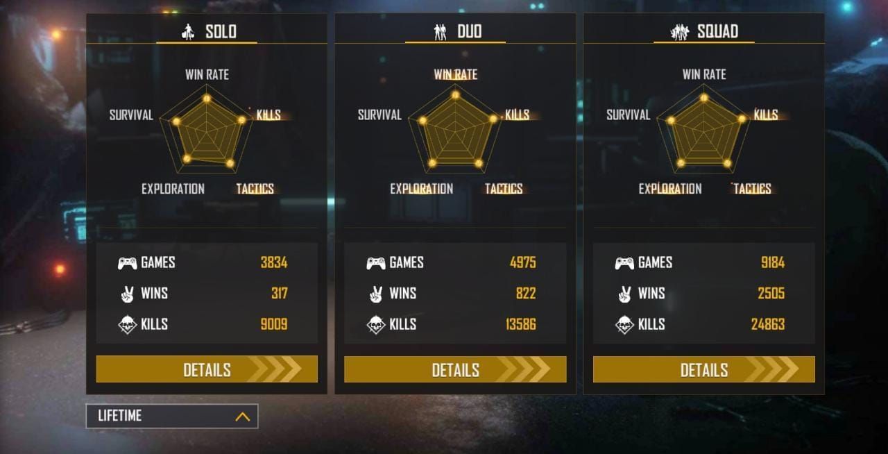 AmitBhai (Desi Gamers) ने 9184 स्क्वाड मैच खेले हैं और उन्हें 2505 में जीत मिली हैं। इस दौरान उन्होंने 24863 किल्स किये हैं और उनका K/D रेश्यो 3.72 का है। उन्होंने 4857 हेडशॉट मारे हैं। इसके साथ ही उन्होंने डुओ मोड में 4975 मैच खेले हैं और उन्हें 822 में जीत मिली हैं। इसके साथ ही वो 13586 किल्स कर चुके हैं और उनका K/D 3.27 का है। उन्होंने 2749 हेडशॉट मारे हैं। उन्होंने सोलो मोड में 3834 मैचों में से 317 में जीत दर्ज की हुई है। इसके साथ ही उनका K/D रेश्यो 2.56 का है जबकि वो 9009 किल्स कर चुके हैं। उनका हेडशॉट प्रतिशत 25.41% का है।
