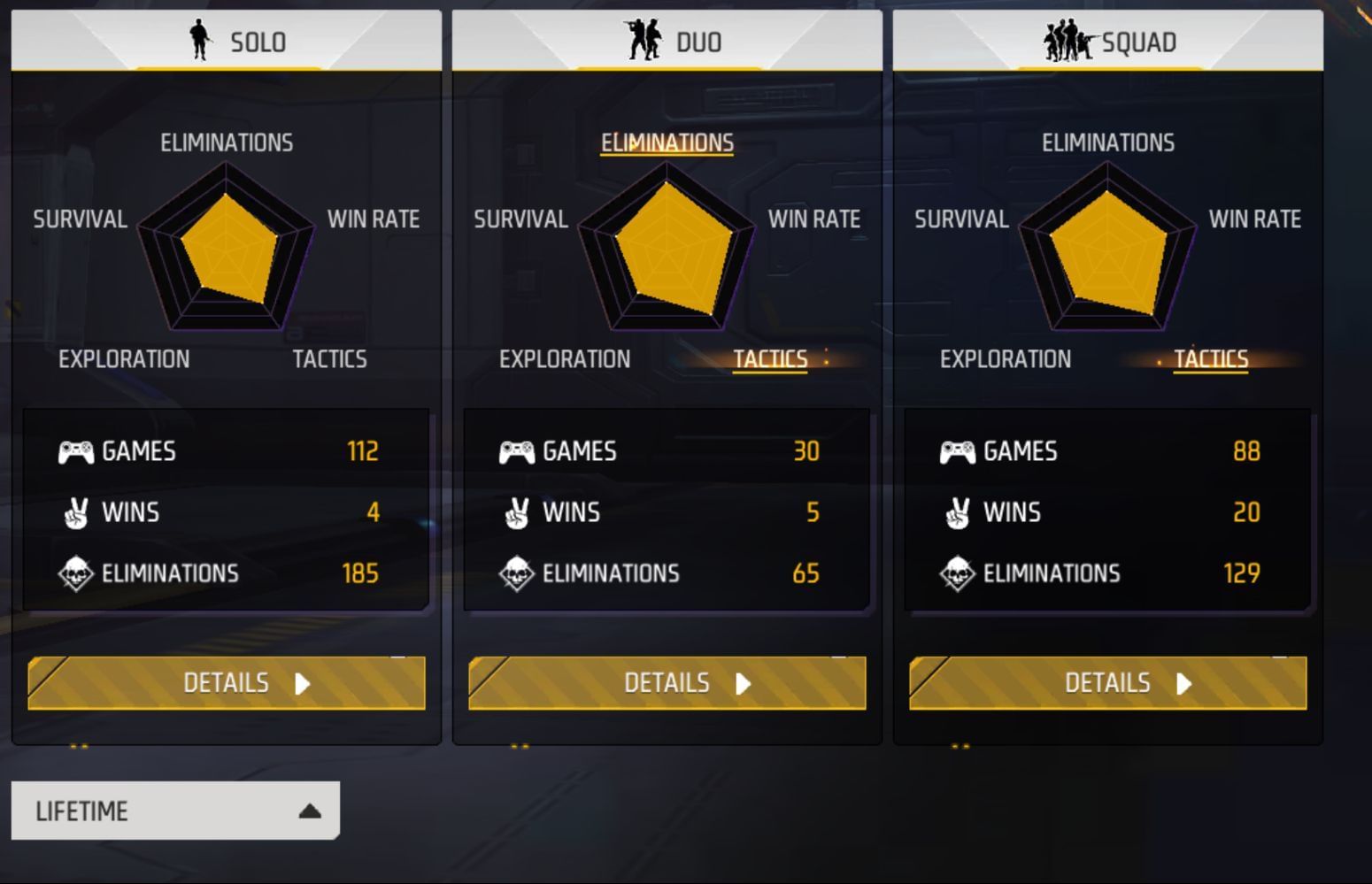 Alpha Gaming ने फ्री फायर मैक्स में 88 स्क्वाड मैच खेले हैं और उन्हें 20 में जीत मिली हैं। इस दौरान उन्होंने 129 किल्स किये हैं और उनका K/D रेश्यो 1.71 का है। इसके साथ ही उन्होंने डुओ मोड में 30 मैच खेले हैं और उन्हें 5 में जीत मिली हैं। इसके साथ ही 65 किल्स कर चुके हैं और उनका K/D 2.60 का है। उन्होंने सोलो मोड में 112 मैचों में से 4 जीत दर्ज की हुई है। इसके साथ ही उनका K/D 1.90 रेश्यो का है जबकि वो 185 किल्स कर चुके हैं।