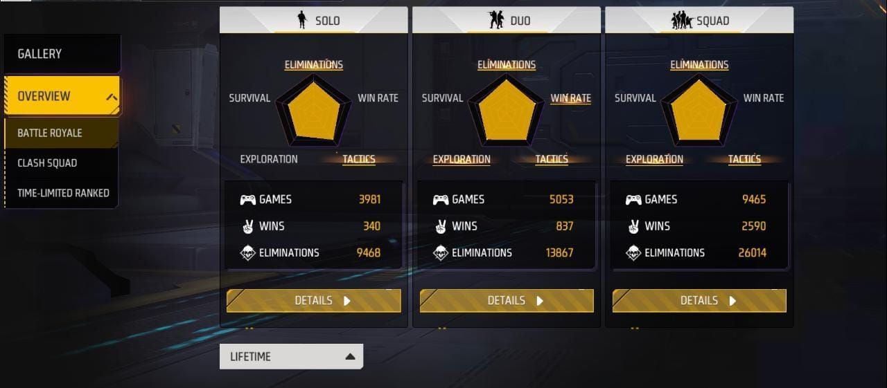 AmitBhai ने फ्री फायर मैक्स में 9465 स्क्वाड मैच खेले हैं और उन्हें 2590 जीत मिली हैं। इस दौरान उन्होंने 26014 किल्स किये हैं और उनका K/D रेश्यो 3.78 का है। इसके साथ ही उन्होंने डुओ मोड में 5053 मैच खेले हैं और 837 में जीत हासिल की है। उन्होंने 13867 किल्स कर चुके हैं और उनका K/D रेश्यो 3.29 का है। इस खिलाड़ी ने सोलो मोड में 3981 मैच खेले हैं और 340 में जीत हासिल की है। उन्होंने कुल 9468 किल्स किये हैं और उनका K/D रेश्यो 2.60 का है।