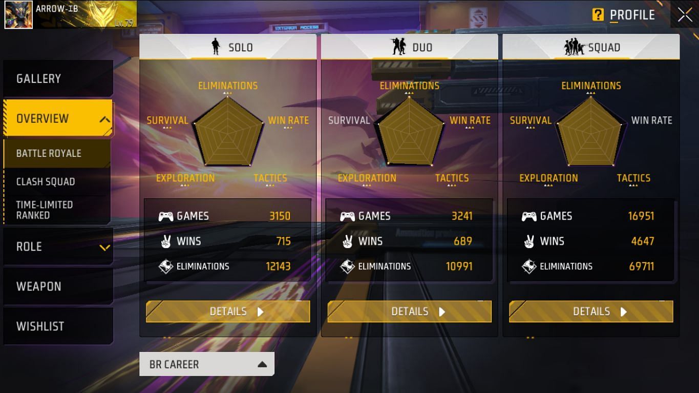 Arrow IB ने स्क्वाड मोड में 16951 मैच खेले हैं और उन्हें 4647 में जीत मिली है। वो 69711 एलिमिनेशन कर चुके हैं और उनका K/D रेश्यो 5.67 का है। उन्होंने 3241 डुओ मैचों में हिस्सा लेते हुए 689 जीत दर्ज की है। वो 10991 किल कर चुके हैं और उनका K/D रेश्यो 4.31 का है। IB ने 3150 सोलो मैच खेले हैं और उन्हें 715 जीत दर्ज की हुई है। वो 12143 किल कर चुके हैं और उनका K/D रेश्यो 4.99 का है।