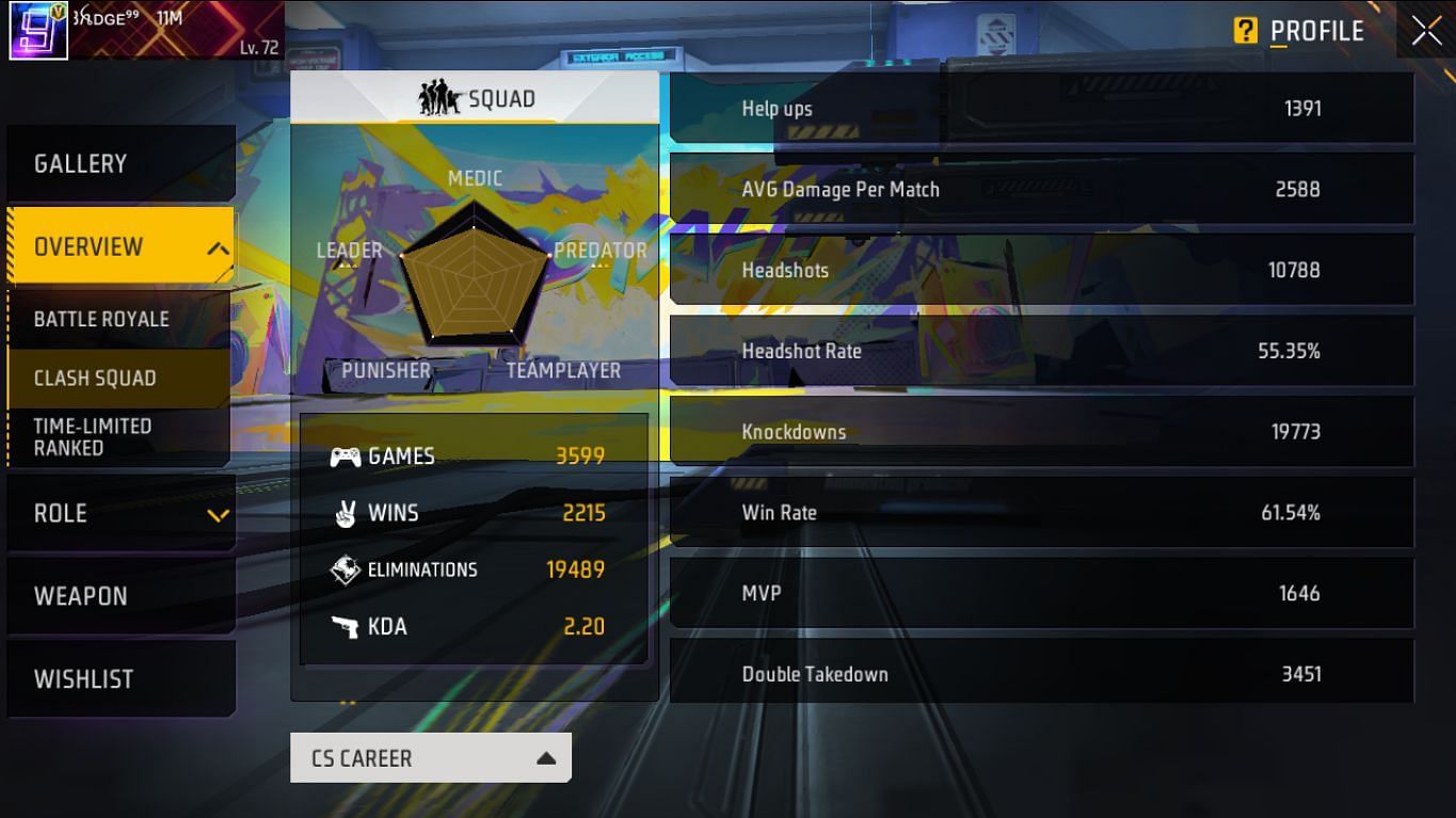 Badge 99 ने क्लैश स्क्वाड मोड में 3599 मैच खेले हैं और इसमें से 2215 में उनकी जीत हुई है। वो 19489 एलिमिनेशन कर चुके हैं और उनका KDA 2.20 का है। वो 1646 मैचों में MVP रहे हैं और उनका जीत प्रतिशत 61.54% का है।