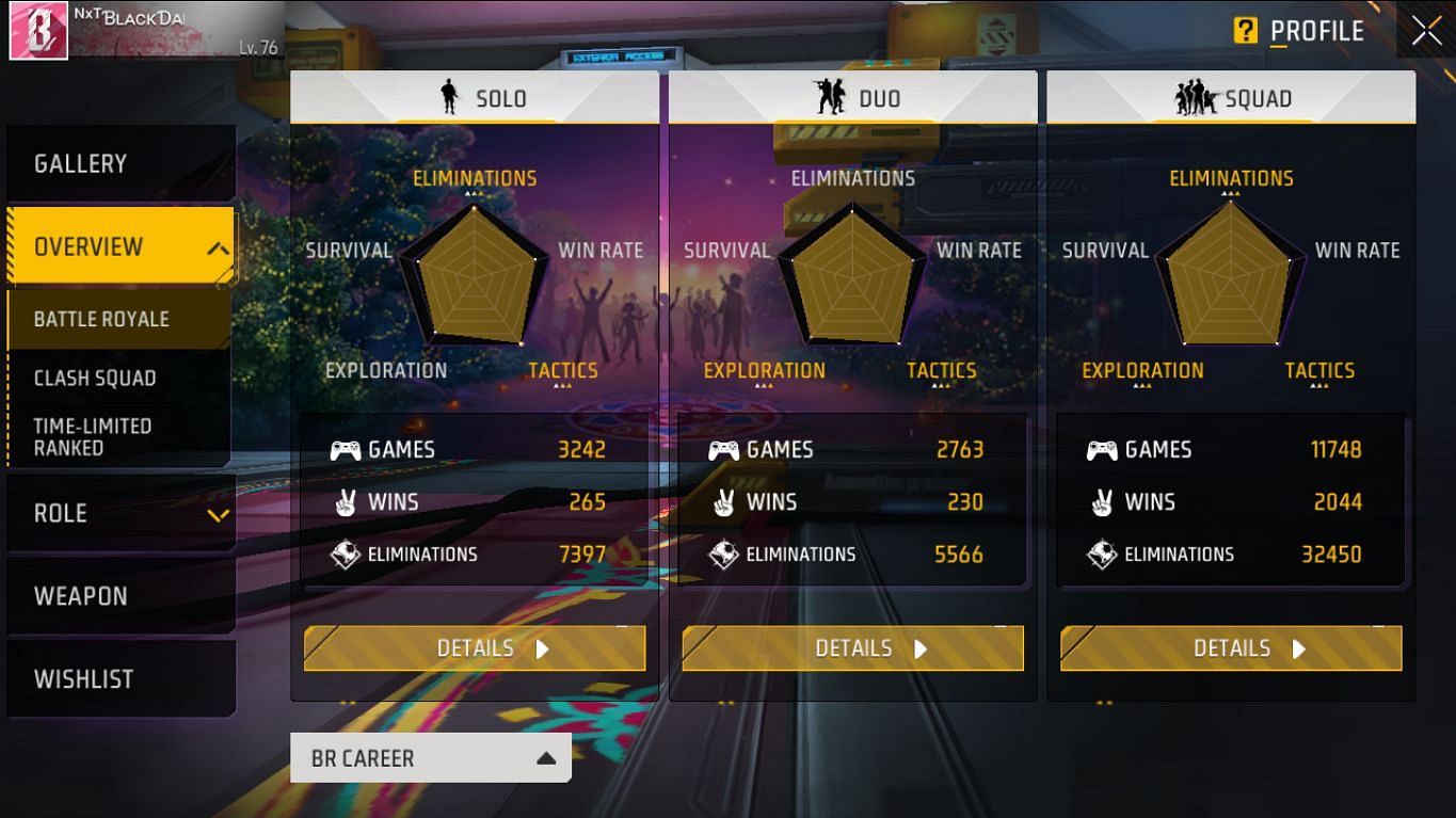 Black Daku ने स्क्वाड मोड में 11748 मैच खेले हैं और उन्हें 2044 में जीत मिली है। वो 32450 एलिमिनेशन करने में सफल हुए हैं और उनका K/D रेश्यो 3.34 का है। उन्होंने अब तक 2763 डुओ मैचों में जगह बनाई है और 230 जीत प्राप्त की है। वो 5566 किल कर चुके हैं और उनका K/D रेश्यो 2.20 का है। Black Daki ने सोलो मोड में 3242 मैच खेले हैं और उन्हें 265 में जीत प्राप्त की है। वो 7397 एलिमिनेशन कर चुके हैं और उनका K/D रेश्यो 2.48 का है।