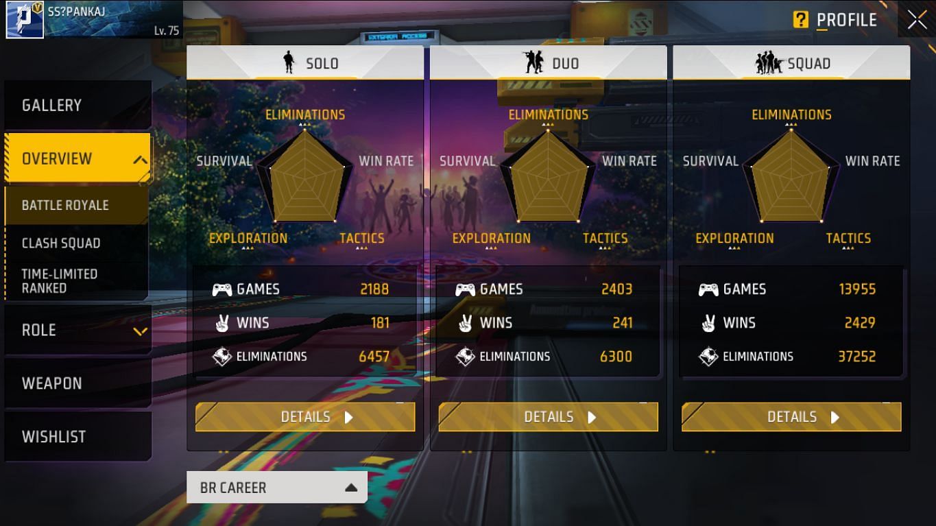 BlackPink Gaming ने स्क्वाड मोड में अभी तक 12439 मैच खेले हैं और इसमें से उन्होंने 2831 में जीत दर्ज की है। 31868 किल कर चुकी हैं और उनका K/D रेश्यो 3.32 का है। डुओ मोड में उन्होंने 11595 मैच खेले हैं और उन्हें 2010 में जीत मिली है। वो 29409 एलिमिनेशन कर चुकी हैं और उनका K/D रेश्यो 3.07 का है। सोलो मोड में BlackPink Gaming ने 6329 मैचों में से 652 जीते हैं। उन्होंने 13679 किल किए हैं और उनका K/D रेश्यो 2.41 का है।