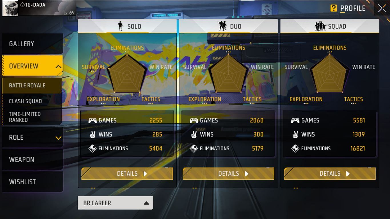 TG Dada की Free Fire MAX ID 401123079 और वो 69 लेवल पर हैं। नीचे उनके बैटल रॉयल स्टैट्स हैं: