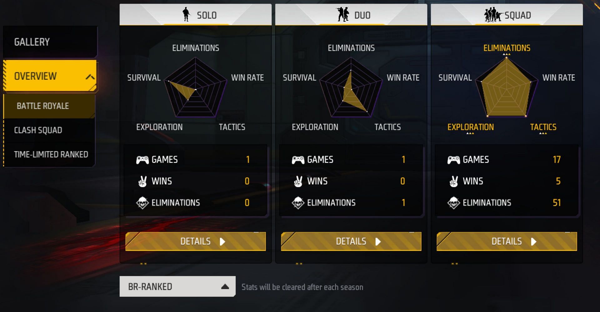 Chino RB ने फ्री फायर मैक्स में बैटल रॉयल रैंक मोड में 17 स्क्वाड मैच खेलकर 5 में जीत हासिल की है। उन्होंने 51 किल्स किये हैं और उनका K/D रेश्यो 4.25 का है। उनका जीत प्रतिशत 29.41% है। इस खिलाड़ी ने डुओ मोड में 1 मैच खेलकर 1 किल्स किया है। सोलो मोड में 1 मैच खेला है।