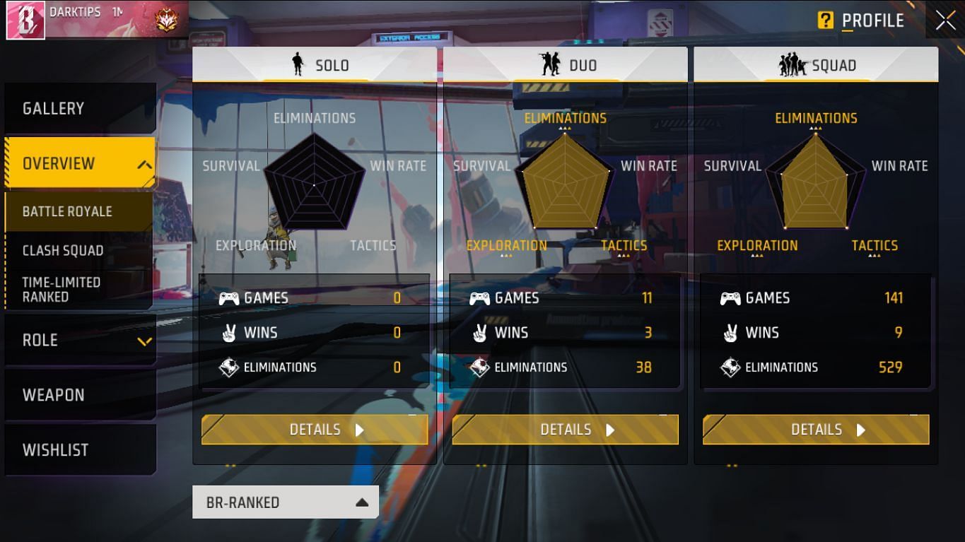 Dark Tips FF ने मौजूदा रैंक सीजन में 141 स्क्वाड मैच खेलते हुए 9 में जीत प्राप्त की है। वो 529 किल कर चुके हैं और उनका K/D रेश्यो 4.01 का है। उन्होंने 11 डुओ मैचों में से 3 जीते हैं। वो 38 एलिमिनेशन कर चुके हैं और उनका K/D रेश्यो 4.75 का है। उन्होंने मौजूदा रैंक सीजन में कोई सोलो मैच नहीं खेला है।