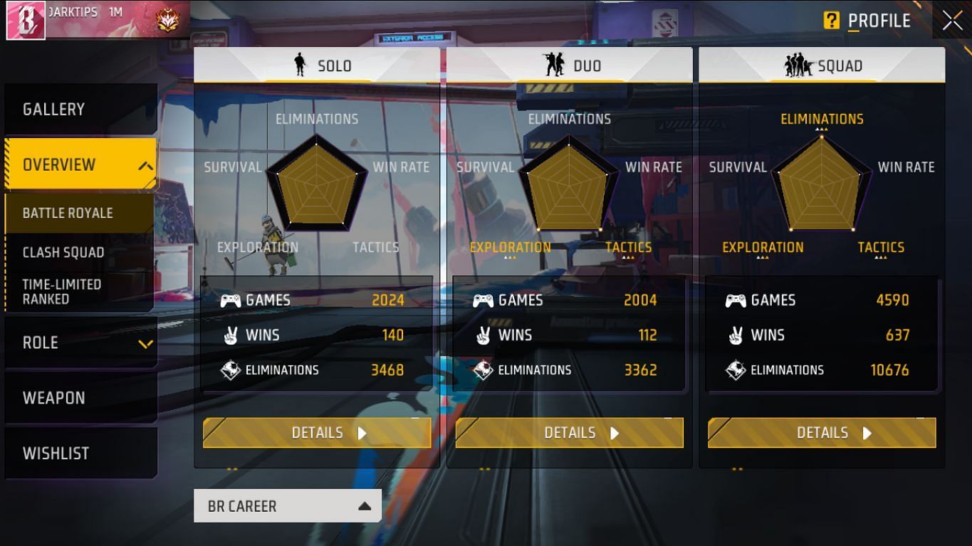 Dark Tips FF ने स्क्वाड मोड में 4590 मैच खेले हैं और उन्हें 637 में जीत मिली है। वो 10676 किल कर चुके हैं और उनका K/D रेश्यो 2.70 का है। उन्होंने 2004 डुओ मैचों में हिस्सा लेते हुए 112 में जीत दर्ज की है। वो यहां 3362 एलिमिनेशन कर चुके हैं और उनका K/D रेश्यो 1.78 का है। Dark Tips FF ने 2024 सोलो मोड में 140 जीते हैं। वो 3468 किल कर चुके हैं और उनका K/D रेश्यो 1.84 का है।