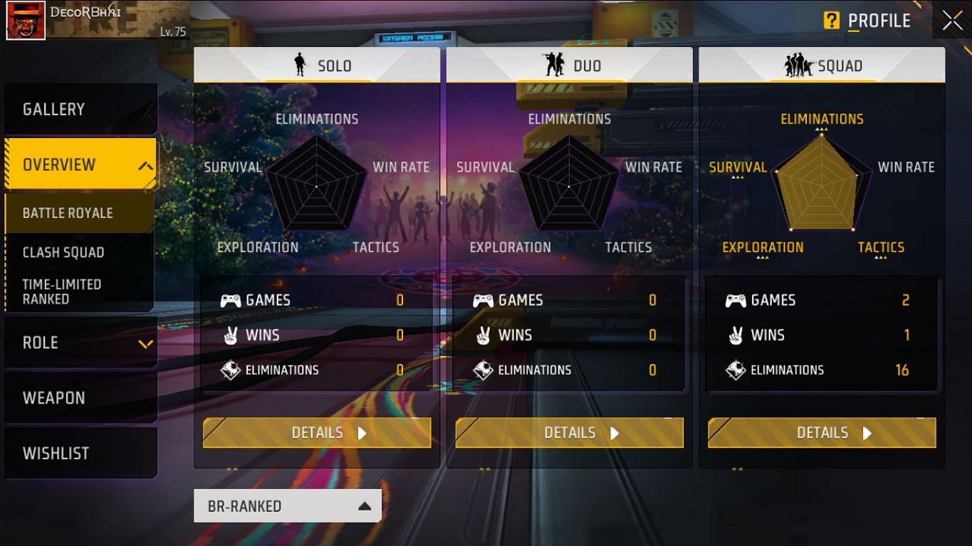 मौजूदा रैंक सीजन में Decor Gaming ने 2 स्क्वाड मैच खेले हैं और 1 में उनकी जीत हुई है। इसके अलावा वो 16 एलिमिनेशन कर चुके हैं और उनका K/D रेश्यो भी उतना ही है। उन्होंने डुओ और सोलो मोड में कोई मैच नहीं खेला है।