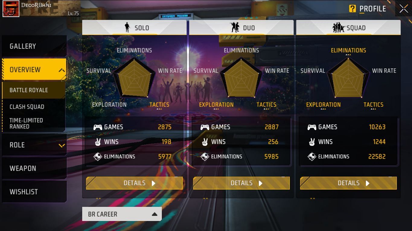 Decor Gaming की Free Fire MAX ID 224525877 है और वो 75 लेवल पर हैं। उनका IGN DecorBhai है और नीचे उनके करियर स्टैट्स हैं: