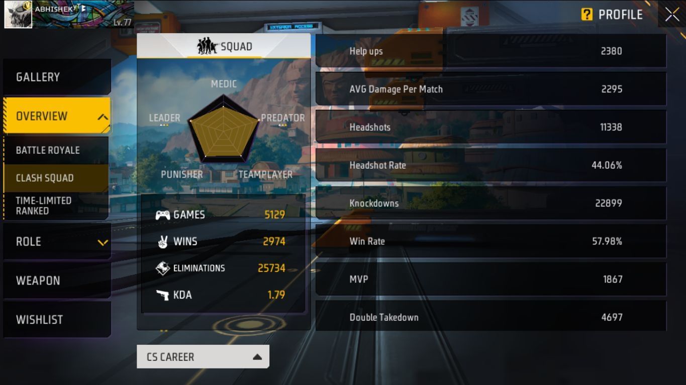 Abhishek YT ने क्लैश स्क्वाड मोड में 5129 मैचों में हिस्सा लिया है और वो 2974 जीतने में सफल हुए हैं। उन्होंने 25734 किल किए हैं और उनका KDA 1.79 का है। वो 1867 मैचों में MVP रहे हैं और उनका जीत प्रतिशत 57.98% है।