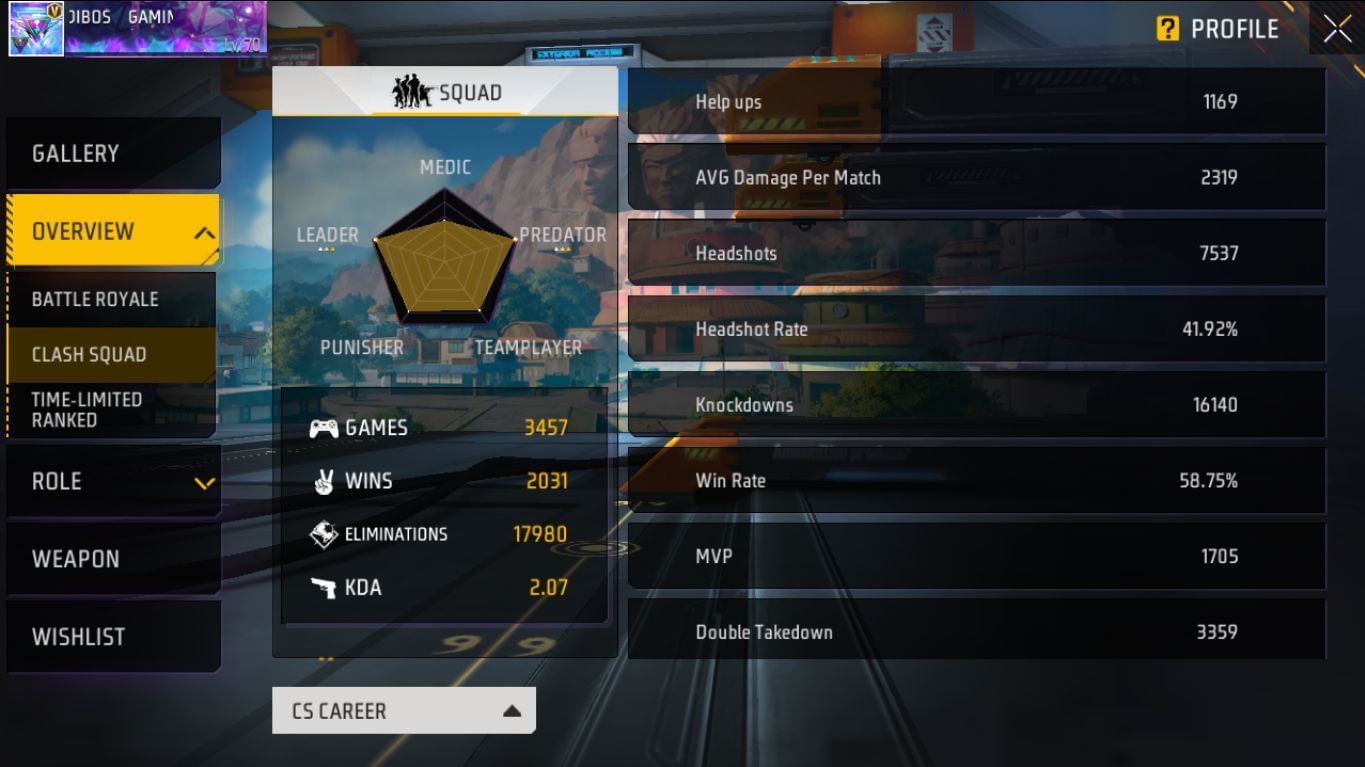 Dibos Gaming ने 3457 क्लैश स्क्वाड मैचों में जगह बनाई है और वो 2031 जीत प्राप्त कर चुके हैं। उन्होंने 17980 एलिमिनेशन निकाले हैं और उनका KDA 2.07 है। वो 1705 मुकाबलों में MVP रहे हैं और उनका जीत प्रतिशत 58.75% का है।