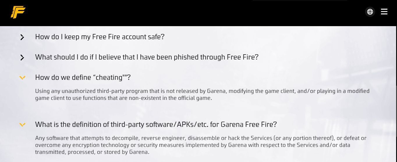 Garena के पास चीटिंग के लिए काफी तगड़ी पॉलिसी है। इस एंटी-हैक FAQ की जानकारी आधिकारिक वेसबाइट पर दी गई है। इसके हिसाब से ऐप में किसी तरह का बदलाव करके उसे मोडिफाई करना चीटिंग में गिनी जाती है। इसके चलते आपका अकाउंट हमेशा के लिए बैन किया जा सकता है।