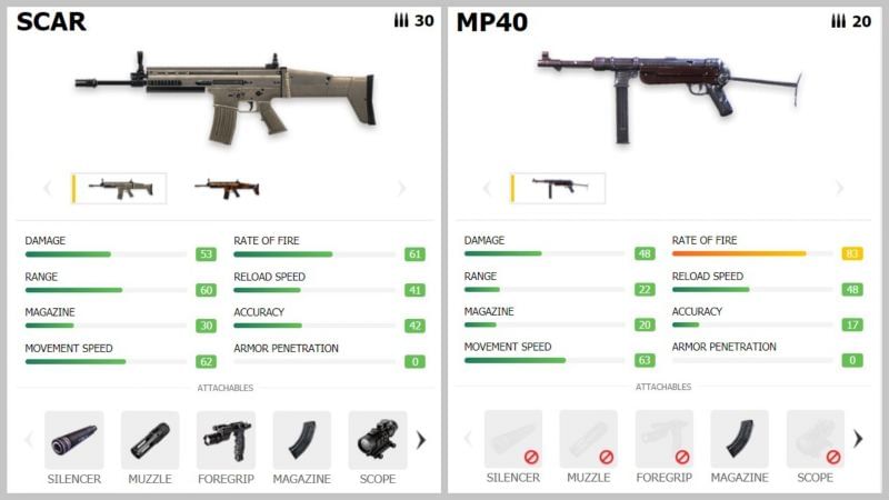 असल राइफल्स के साथ SMG का उपयोग करके खिलाड़ी फायदा उठा सकते हैं। आप असल रायफल्स के रूप में ज्यादा फायर रेट वाली गन्स चुन सकते हैं। इसमें Famas, AUG, Scar, M4A1 और अन्य कई विकल्प शामिल है। इसके अलावा आप क्लोज रेंज के लिए MP40 को चुन सकते हैं। आक्रमक खिलाड़ियों के लिए यह जबरदस्त विकल्प है।