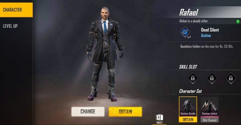 इसमें डेड साइलेंट नाम की ताकत है। इससे मैप पर 8 सेकंड्स के लिए गनशॉट्स छुप जाते हैं और इसमें 90 सेकंड्स का कूलडाउन रहता है। Rafael कैरेक्टर को 8000 गोल्ड कोइंस में पाया जा सकता है। रैंक मोड में ये कैरेक्टर उतना काम नहीं आता है क्योंकि 8 सेकंड्स से गेम में ज्यादा फर्क नहीं पड़ता है। इसके बजाय उन्हें इतनी कीमत में अन्य कैरेक्टर का रुख करना चाहिए।