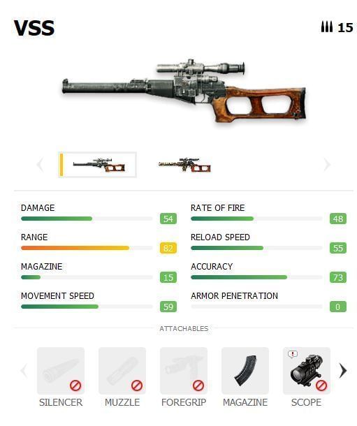 3.VSS: कम अटैचमेंट्स लगने की वजह से इस बन्दूक का इस्तेमाल करना बहुत बेकार माना जाता है। गन की हाई रेंज होने के साथ इसका डैमेज और बाकी चीज़ें ख़राब है जो इसका इस्तेमाल खराब कर देती हैं। यह गन इन सभी कारणों की वजह से बहुत बेकार मानी जाती है पूरे गेम में और इसका इस्तेमाल केवल सुरक्षित मिड रेंज से किया जाना चाहिए।