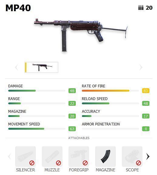 2. MP40: जब बात SMG की आती है , तब इस बन्दूक को सबसे खराब माना जाता है गेम में। एक अच्छी चीज़ इस बन्दूक की है इसका फायरिंग रेट लेकिन वह भी किसी काम का नहीं होता इसकी कम गोलियां भरने की वजह से एक बार में। इस बन्दूक का कम डैमेज, ख़राब रेंज, और गलत एक्यूरेसी इसको सबसे खराब बन्दूक बनाती है गेम की। यह गन सही अटैचमेंट्स लगा कर थोड़ी बेहतर बन सकती है हालाँकि इस बन्दूक से बेहतर ऑप्शन आपके पास है।