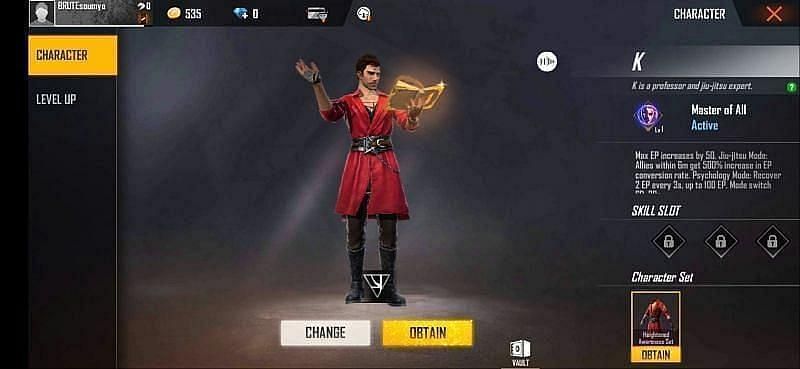 K एक बेहतरीन कैरेक्टर है, जिसे Free Fire में स्किल कॉम्बिनेशन के दौरान इस्तेमाल कर सकते हैं। जैसे Kelly, Hayato, और Moco इसके आलावा K को डेडली कैरेक्टर कहते हैं। यह अग्रेसिव होने के साथ पैसिव एबिलिटी वाला कैरेक्टर है।