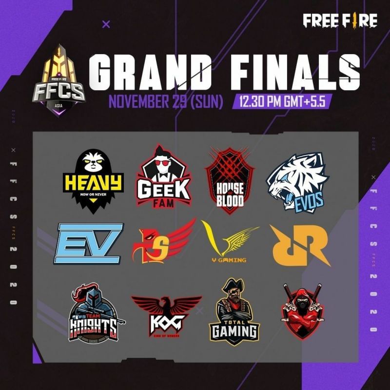प्ले-इंस द्वारा 5 टीमें प्रतियोगिता का हिस्सा बनी है और बाकी टीमें सीधा क्वालीफाई कर चुकी थी। Free Fire Continental Series Asia 2020 ग्रैंड फाइनल्स का आयोजन 29 नवंबर 2020 को किया जाने वाला है।