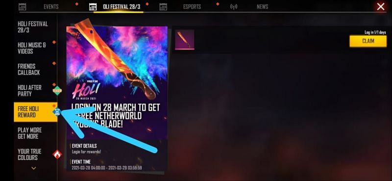 स्टेप 3: इसके बाद 'Free Holi Reward' इवेंट के विकल्प को चुनें और फिर आपको 'Claim' के विकल्प पर क्लिक करते हुए स्किन को हासिल करना है।