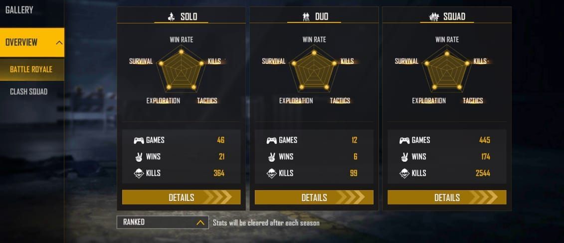 Munna Bhai Gaming ने Free Fire रैंक मोड में 445 स्क्वाड मैच खेलकर 174 में जीत हासिल की है। उन्होंने 2544 किल्स किये हैं और उनका K/D रेश्यो 9.39 का है। इस खिलाड़ी ने डुओ मोड में 12 मैच खेले हैं, और उन्होंने 6 किल्स किये हैं और उनका K/D रेश्यो 16.50 का है। इस प्रोफेशनल यूट्यूबर ने Free Fire सोलो मोड में 46 मैच खेलकर 21 में जीत हासिल की है। उन्होंने 364 किल्स किये हैं और उनका K/D रेश्यो 14.56 का है।