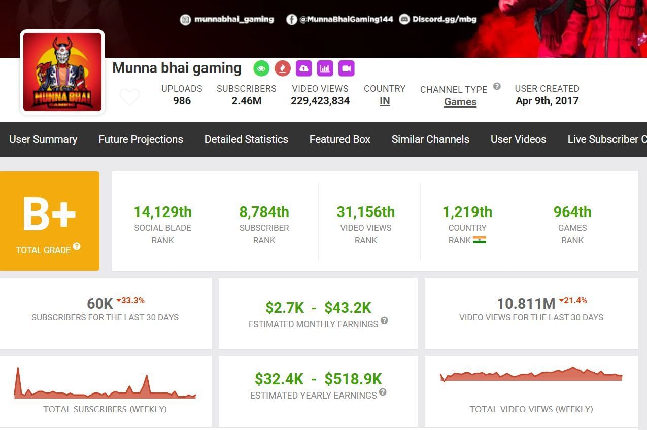 सोशल ब्लेड के अनुसार Munna Bhai Gaming की यूट्यूब से महीने की कमाई $2.7K से $43.2K है, साथ ही उनकी साल भर की कमाई $32.4K से $518.9 मिलियन है।
