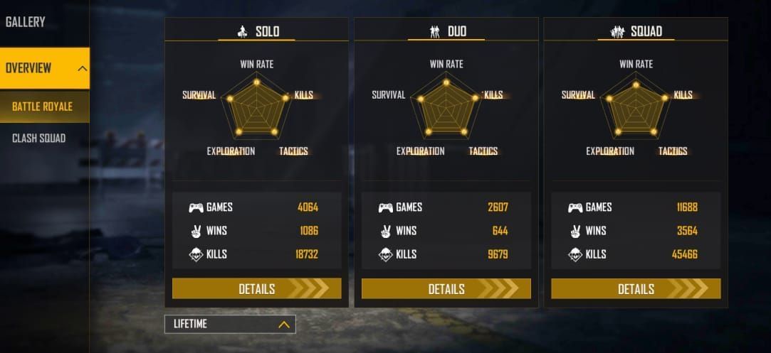 Munna Bhai Gaming ने Free Fire में 11688 स्क्वाड मैच खेलकर 3564 में जीत हासिल की है। उन्होंने 45466 किल्स किये हैं और उनका K/D रेश्यो 5.60 का है। इस खिलाड़ी ने डुओ मोड में 2607 मैच खेले हैं इस दौरान उन्होंने 644 में जीत हासिल की है। उन्होंने 9679 किल्स किये हैं और उनका K/D रेश्यो 4.93 का है। इस यूट्यूबर ने Free Fire सोलो मोड में 4064 मैच खेलकर 1086 में जीत हासिल की है। उन्होंने 18732 किल्स किये हैं और उनका K/D रेश्यो 6.29 का है।