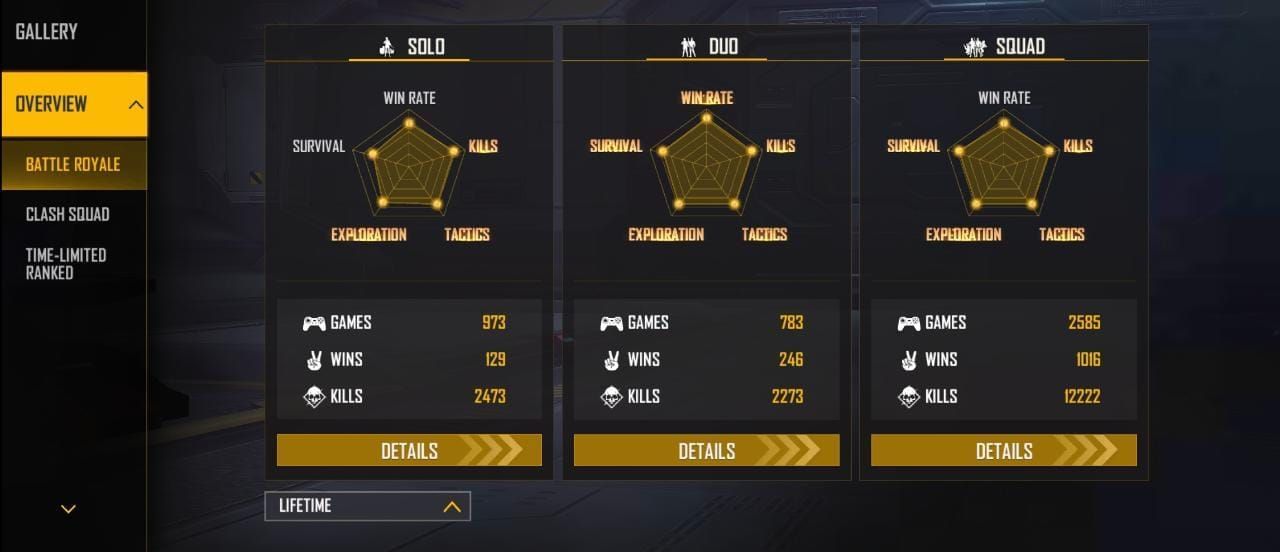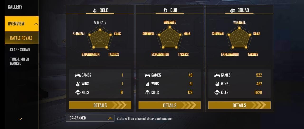 DDG Gamers ने गरेना फ्री फायर मैक्स में क्लैश स्क्वाड रैंक मोड के अंदर 922 स्क्वाड मैच खेले हैं और उन्हें 487 में जीत मिली हैं। इस दौरान उन्होंने 5620 किल्स किये हैं और उनका K/D 12.92 रेश्यो का है। इसके साथ ही उन्होंने डुओ मोड में 49 मैच खेले हैं और उन्हें 21 में जीत मिली हैं। इसके साथ ही 173 किल्स कर चुके हैं और उनका K/D 6.18 का है। उन्होंने सोलो मोड में 1 मैचों में से 1 जीत दर्ज की हुई है। इसके साथ ही उनका K/D 6.00 रेश्यो का है जबकि वो 6 किल्स कर चुके हैं।