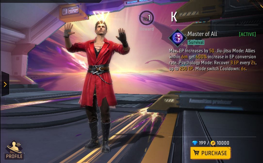 K कैरेक्टर के पास Master of All नाम की ताकत है। इसकी मदद से आपकी EP 50 तक बढ़ जाती है। इसमें दो अलग-अलग तरह के मोड्स हैं। अगर कोई साथी आपके करीब है, तो उसका कन्वर्जन रेट 600% तक बढ़ जाता है। इसके फिजियोलॉजी मोड की मदद से आप हर 2 सेकेंड में 3 EP रिकवर कर सकते हैं। आप अधिकतम 250 EP तक इस कैरेक्टर का फायदा उठा सकते हैं। मोड स्विच का कूलडाउन 6 सेकेंड्स हैं।