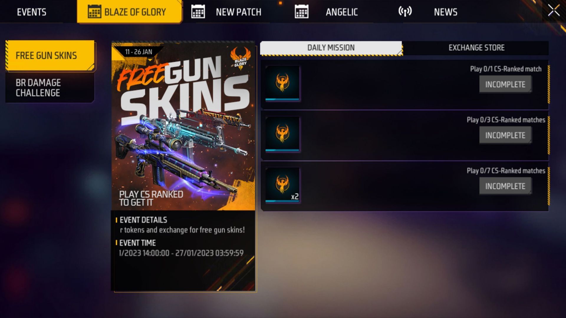 Free Fire Max में भारतीय सर्वर पर न्यू फ्री गन स्किन 11 जनवरी 2023 को जोड़ा गया था। ये 26 जनवरी 2023 तक रनिंग पर रहने वाला है। गेमर्स स्पेशल Fiery Phoenix टोकन को इवेंट में उपलब्ध मिशन को पुरे करके क्लैम कर सकते हैं और मुफ्त में रिवार्ड्स को एक्सचेंज कर सकते हैं।