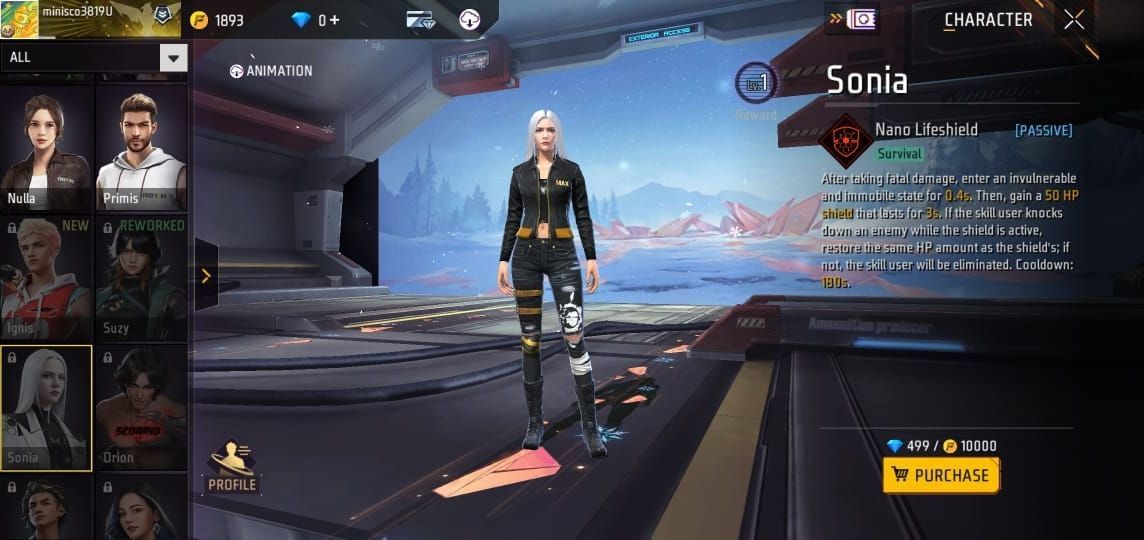 Sonia कैरेक्टर के पास Nano Lifeshield नाम की ताकत देखने को मिलती है। यह पैसिव ताकत वाला फीमेल कैरेक्टर है, जो सर्वाइवल पर आधारित है। अगर मैदान पर विरोधियों के द्वारा आपको डैमेज दिया जाता है, तो अंतिम समय में एक शील्ड बनती है और उस दौरान अगर आप दुश्मन को किल करते हैं, तो शील्ड पॉइंट्स 150 HP में बदल जाते हैं। इसका कूलडाउन समय 180 सेकेंड्स का है।