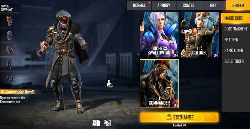 Free Fire L.C. Commander बंडल को डायमंड रॉयल में 2020 में शामिल किया गया था। इसे मैजिक क्यूब से खरीद सकते थे। नीचे इस बंडल के अदंर मौजूद इनाम है: