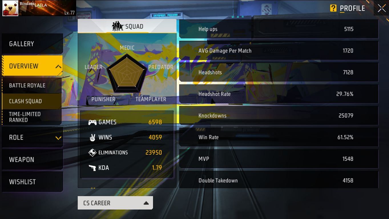Gaming With Laila ने क्लैश स्क्वाड मोड में 6598 मैच खेले हैं और वो 4059 जीत प्राप्त कर चुके हैं। उन्होंने 23950 किल किए हैं और उनका KDA 1.79 का है। उनका जीत प्रतिशत 61.52% का है और वो 1548 मैचों में MVP रहे हैं।