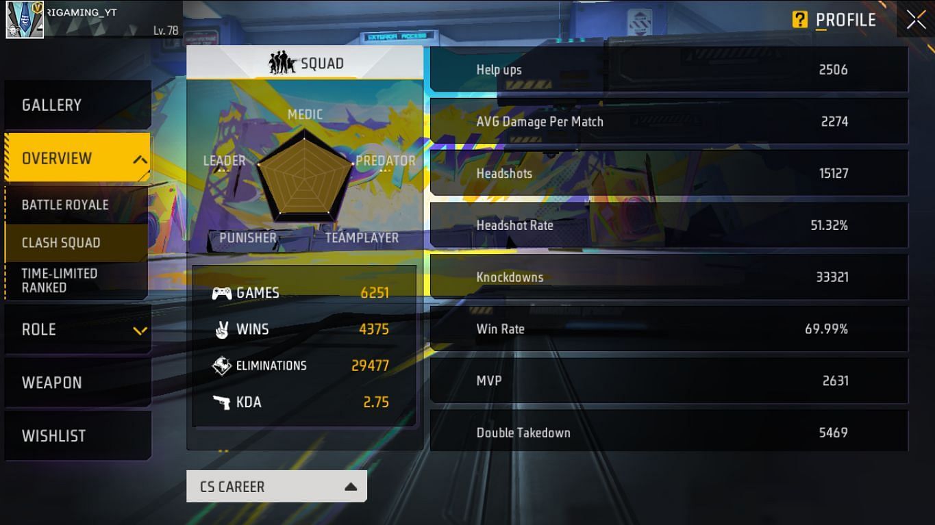 Pri Gaming ने क्लैश स्क्वाड मोड में 6251 मैच खेले हैं और वो 4375 जीत प्राप्त कर चुके हैं। उन्होंने 29477 किल किए हैं और उनका KDA 2.75 का है। उनका जीत प्रतिशत 69.99% का है और वो 2631 मैचों में MVP रहे हैं।