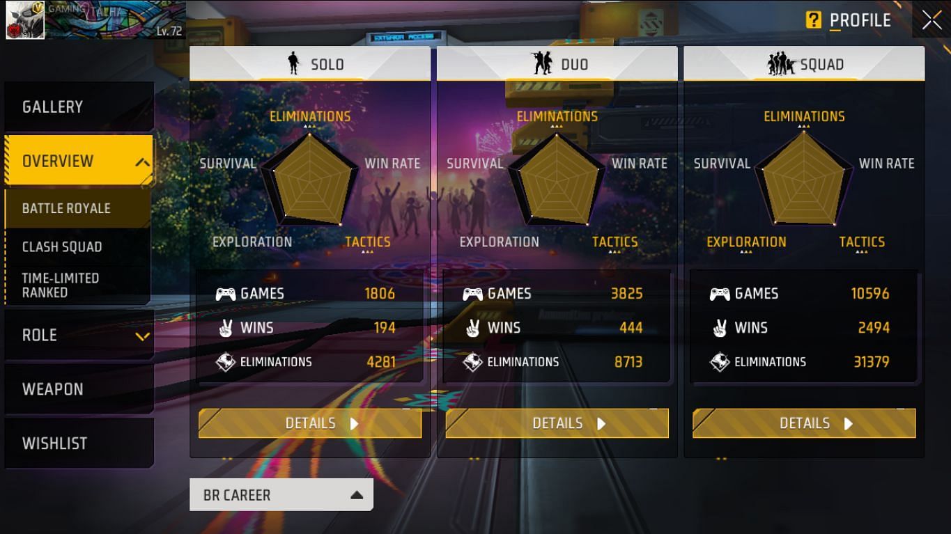 Gaming With Talha ने स्क्वाड मोड में अब तक 10596 मैच खेले हैं और उनकी 2494 में जीत हुई है। वो 31379 एलिमिनेशन कर चुके हैं और उनका K/D रेश्यो 3.87 का है। उन्होंने 3825 डुओ मैचों में हिस्सा लेते हुए 444 जीते हैं। वो 8713 किल कर चुके हैं और उनका K/D रेश्यो 2.58 का है। Gaming With Talha ने 1806 सोलो मैचों में से 194 जीते हैं। वो 4281 एलिमिनेशन करने में सफल हुए हैं और उनका K/D रेश्यो 2.66 का है।