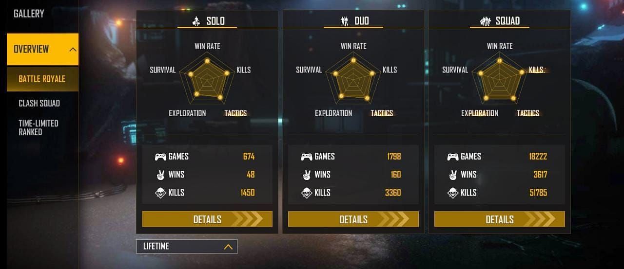GT King ने 18222 स्क्वाड मैच खेले हैं और उन्हें 3617 में जीत मिली हैं। इस दौरान उन्होंने 51785 किल्स किये हैं और उनका K/D रेश्यो 3.55 का है। इसके साथ ही उन्होंने डुओ मोड में 1798 मैच खेले हैं और उन्हें 160 में जीत मिली हैं। इसके साथ ही वो 3360 किल्स कर चुके हैं और उनका K/D 2.05 का है। उन्होंने सोलो मोड में 674 मैचों में से 48 में जीत दर्ज की हुई है। इसके साथ ही उनका K/D रेश्यो 2.32 का है जबकि वो 1450 किल्स कर चुके हैं।