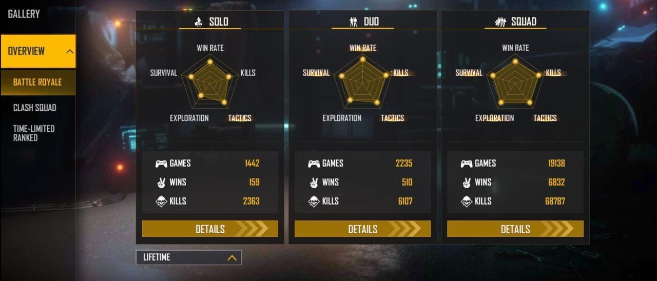 Gyan Gaming ने 19138 स्क्वाड मैच खेले हैं और उन्हें 6832 में जीत मिली हैं। इस दौरान उन्होंने 68787 किल्स किये हैं और उनका K/D 5.59 रेश्यो का है। इसके साथ ही उन्होंने डुओ मोड में 2235 मैच खेले हैं और उन्हें 510 में जीत मिली हैं। इसके साथ ही 6107 किल्स कर चुके हैं और उनका K/D 3.54 का है। उन्होंने सोलो मोड में 1442 मैचों में से 159 में जीत दर्ज की हुई है। इसके साथ ही उनका K/D रेश्यो 1.84 का है जबकि वो 2363 किल्स कर चुके हैं।
