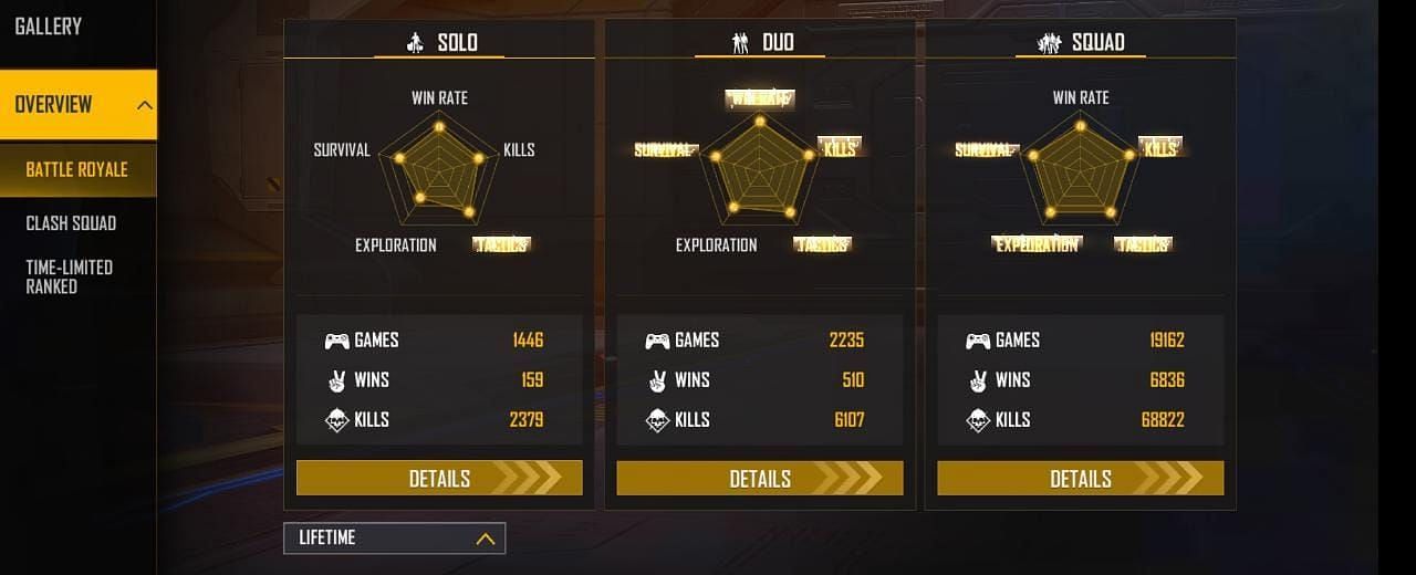 Gyan Gaming ने फ्री फायर मैक्स में 19162 स्क्वाड मैच खेले हैं और उन्हें 6836 में जीत मिली हैं। इस दौरान उन्होंने 68822 किल्स किये हैं और उनका K/D 5.58 रेश्यो का है। इसके साथ ही उन्होंने डुओ मोड में 2235 मैच खेले हैं और उन्हें 510 में जीत मिली हैं। इसके साथ ही 6107 किल्स कर चुके हैं और उनका K/D 354 का है। उन्होंने सोलो मोड में 1446 मैचों में से में 159 जीत दर्ज की हुई है। इसके साथ ही उनका K/D 1.85 रेश्यो का है जबकि वो 2379 किल्स कर चुके हैं।