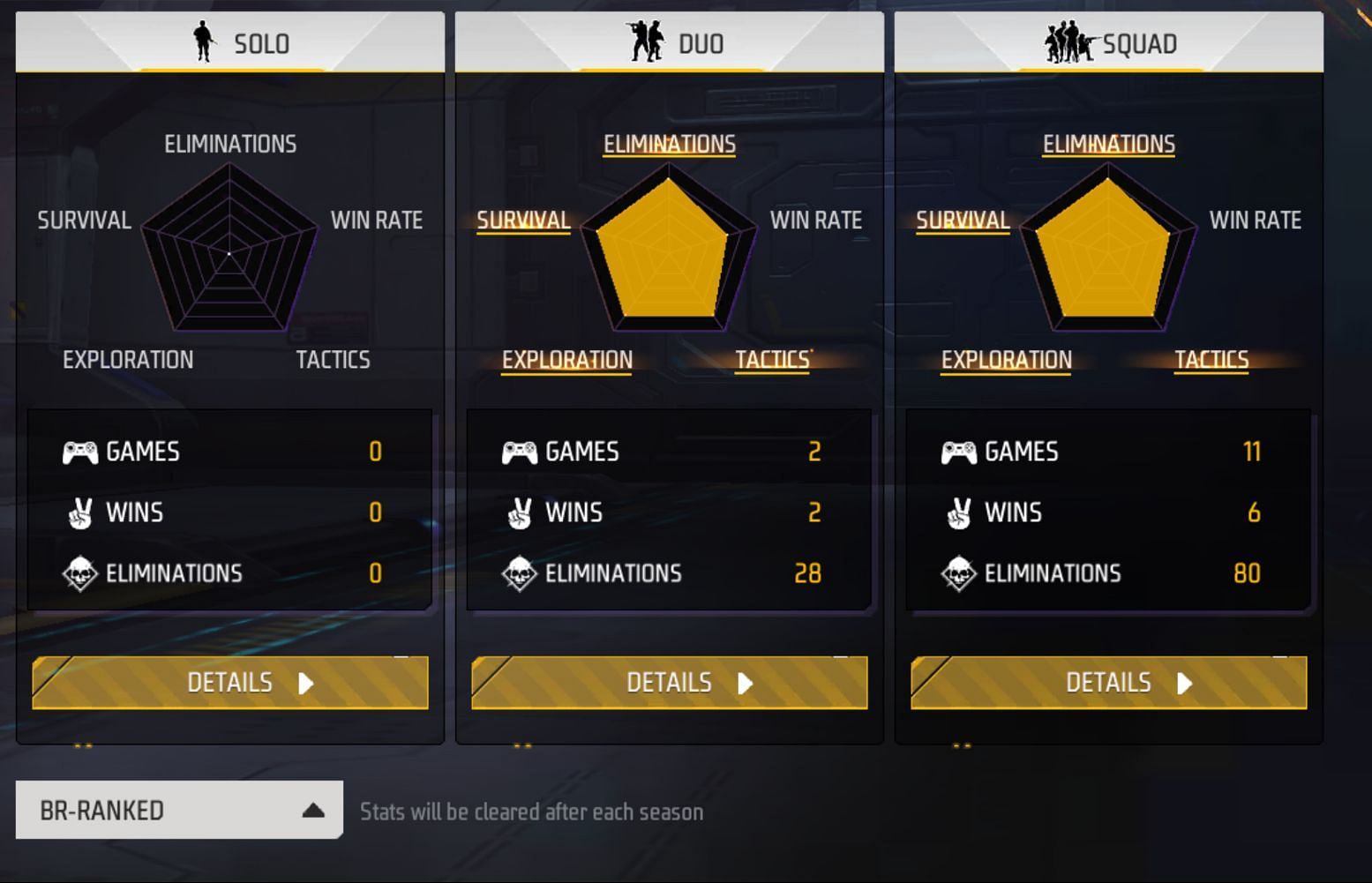 Gyan Rishabh ने फ्री फायर मैक्स में क्लैश स्क्वाड रैंक मोड के अंदर 11 स्क्वाड मैच खेले हैं और उन्हें 6 में जीत मिली हैं। इस दौरान उन्होंने 80 किल्स किये हैं और उनका K/D रेश्यो 28 का है। इसके साथ ही उन्होंने डुओ मोड में 2 मैच खेले हैं और 2 में जीत हासिल की है। उन्होंने 28 किल्स कर चुके हैं और उनका K/D रेश्यो 8 का है। इस खिलाड़ी ने सोलो मोड स्टैट्स शून्य है।