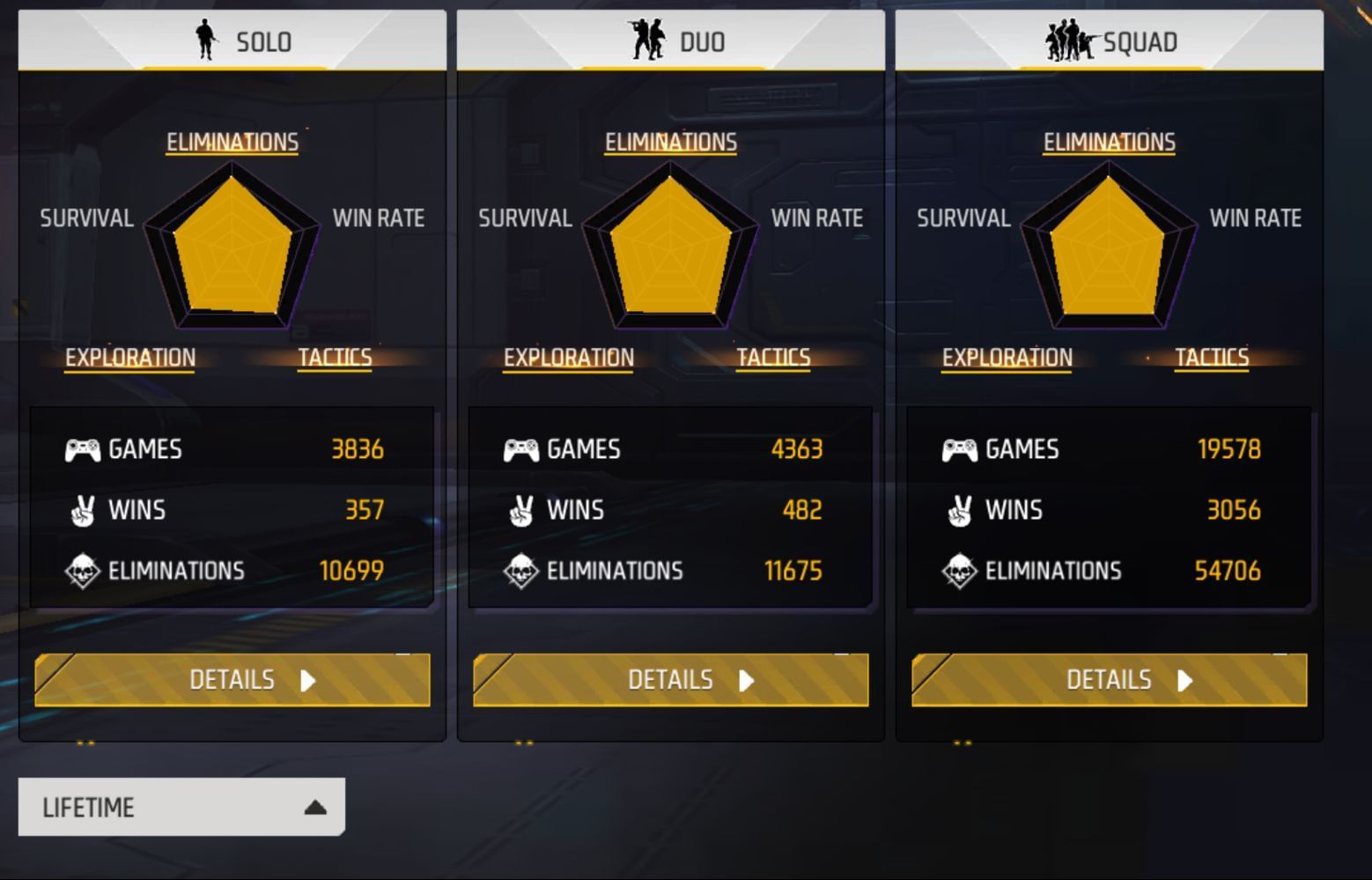 Gyan Rishabh ने फ्री फायर मैक्स में 19578 स्क्वाड मैच खेले हैं और उन्हें 3056 में जीत मिली हैं। इस दौरान उन्होंने 54707 किल्स किये हैं और उनका K/D रेश्यो 3.08 का है। इसके साथ ही उन्होंने डुओ मोड में 4363 मैच खेले हैं और 482 में जीत हासिल की है। उन्होंने 11675 किल्स कर चुके हैं और उनका K/D रेश्यो 3.01 का है। इस खिलाड़ी ने सोलो मोड में 3836 मैच खेले हैं और 357 में जीत हासिल की है। उन्होंने कुल 10699 किल्स किये हैं और उनका K/D रेश्यो 3.31 का है।