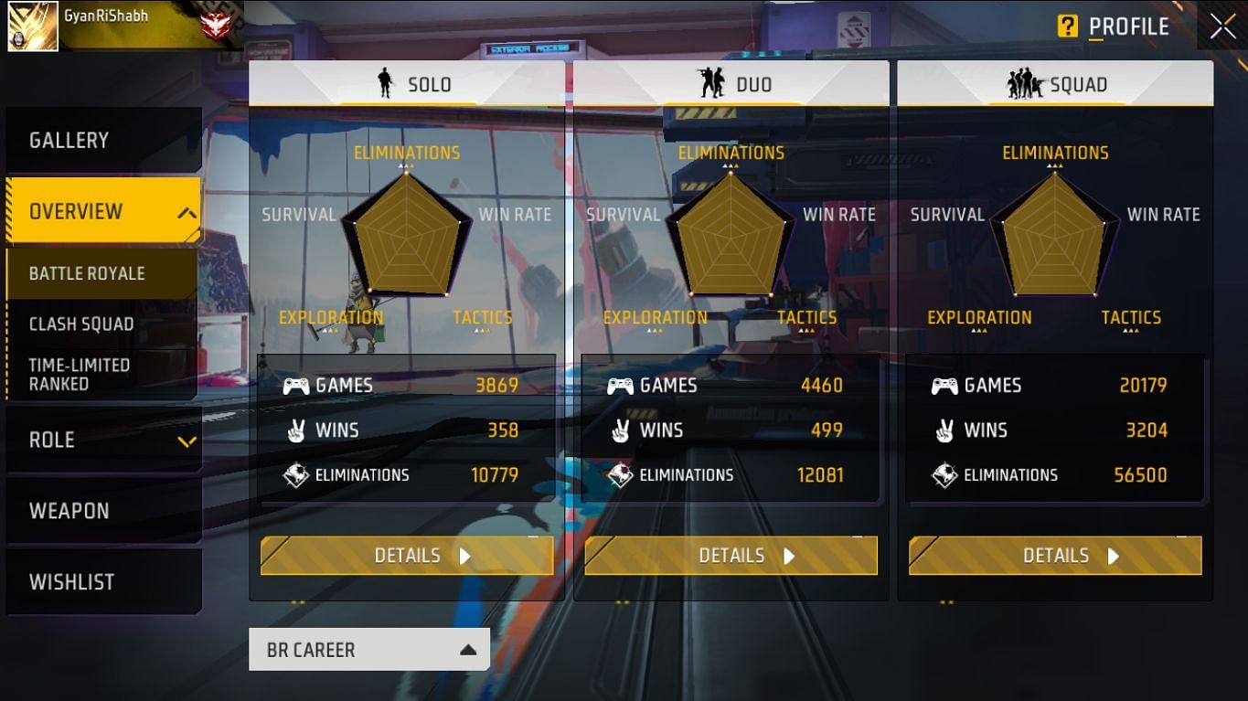 Gyan Rishabh ने अभी तक स्क्वाड मोड में 20179 मैच खेले हैं और उन्हें 3204 में जीत मिली है। वो 56500 किल कर चुके हैं और उनका K/D रेश्यो 3.33 का है। डुओ मोड में उन्होंने 4460 मैचों में हिस्सा लेते हुए 499 जीते हैं। वो 12081 एलिमिनेशन करने में सफल हुए हैं और उनका K/D रेश्यो 3.05 का है। Gyan Rishabh 3869 सोलो मैच खेल चुके हैं और उनका 358 में पलड़ा भारी रहा। वो 10779 किल कर चुके हैं और उनका K/D रेश्यो 3.07 का है।