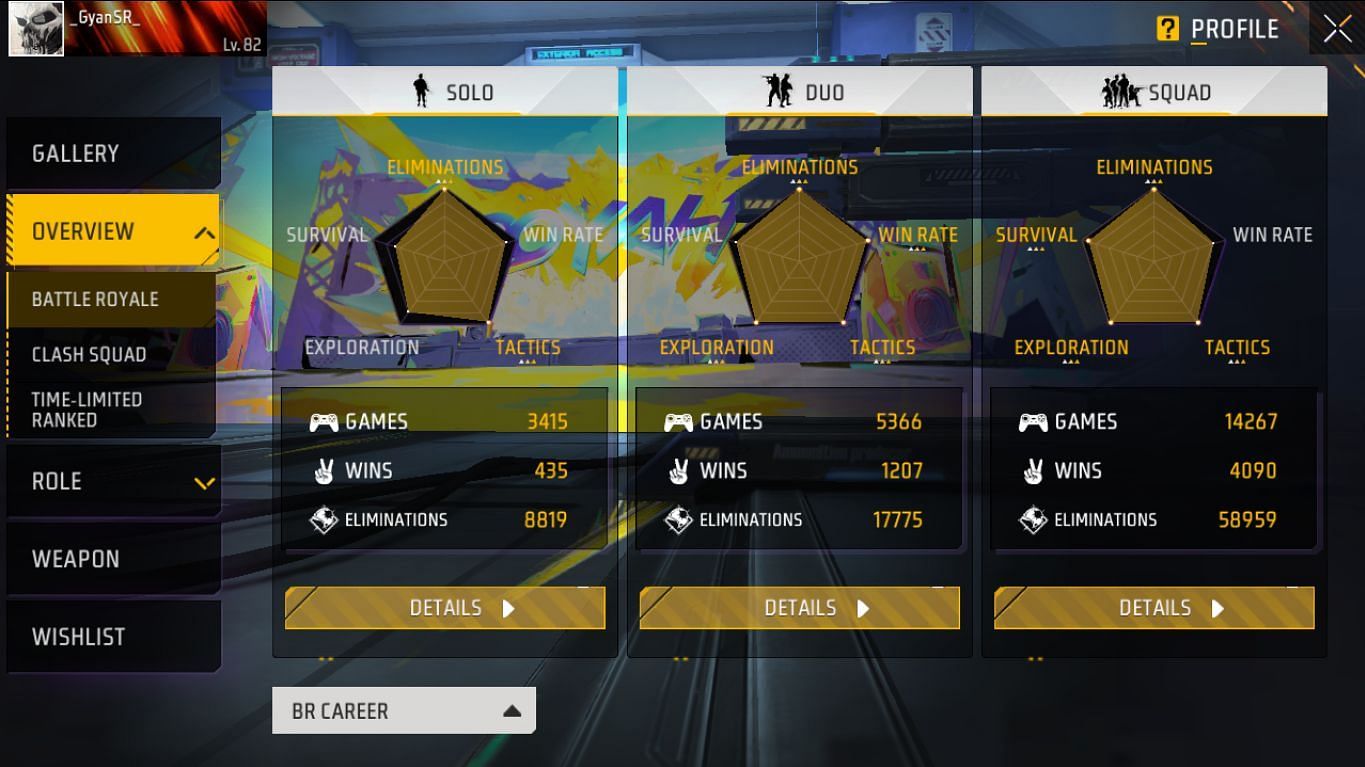 Gyan SR ने स्क्वाड मोड में 14267 मैच खेले हैं और 4090 जीत प्राप्त कर चुके हैं। वो 58959 किल कर चुके हैं और उनका K/D रेश्यो 5.79 का है। वो 5366 डुओ मैचों में से 1207 में जीत दर्ज करने में सफल हुए हैं। उन्होंने 17775 किल किए हैं और उनका K/D रेश्यो 4.27 का है। Gyan SR ने 3415 सोलो मैच खेले हैं और 435 में उनकी जीत देखने को मिली है। वो 8819 एलिमिनेशन कर चुके हैं और उनका K/D रेश्यो 2.96 का है।