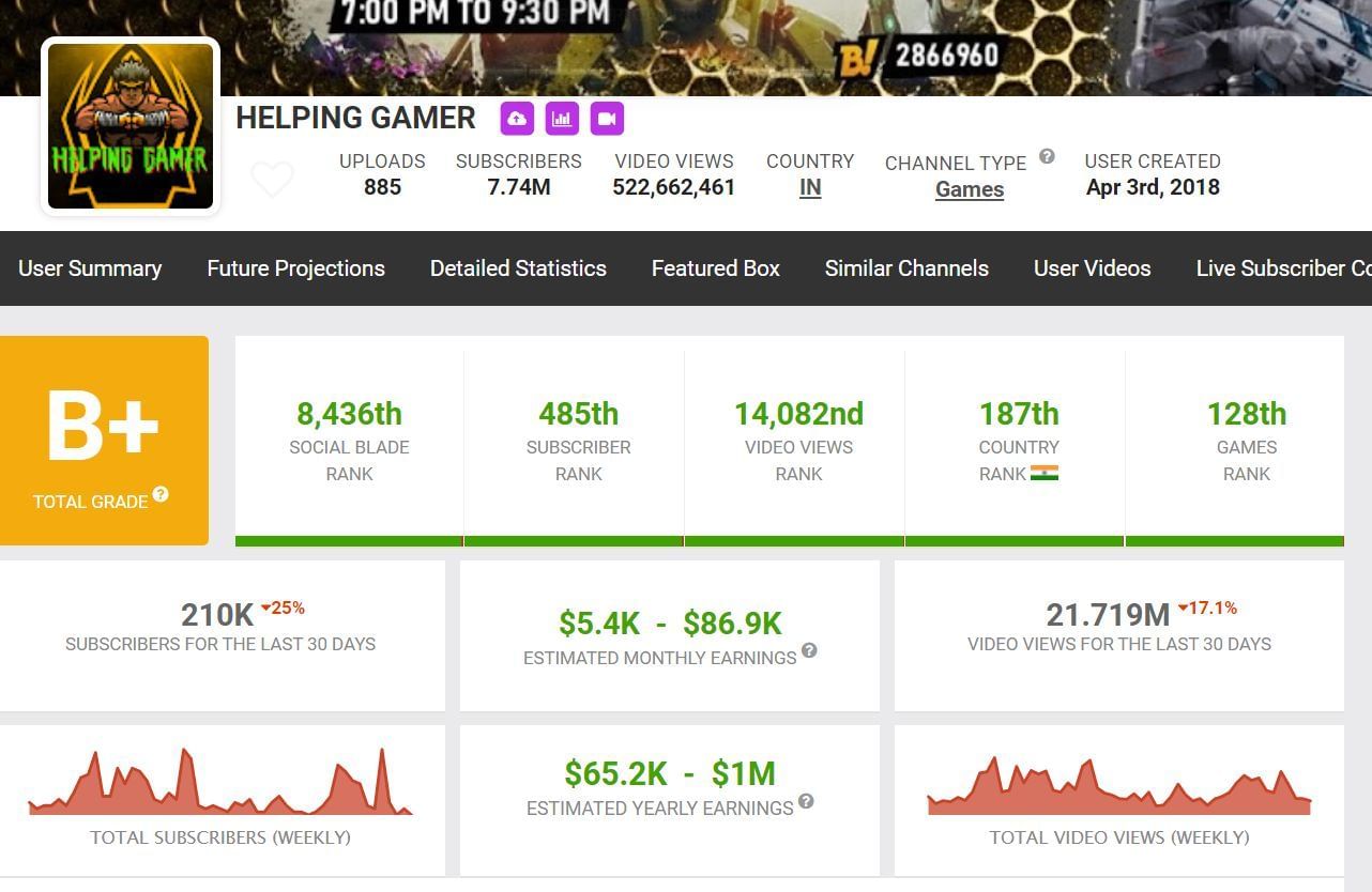 सोशल ब्लेड के अनुसार Helping Gamer की यूट्यूब से महीने की कमाई $5.4K से $86.9K है, साथ ही उनकी साल भर की कमाई $65.2K से $1 मिलियन है।