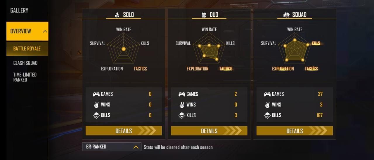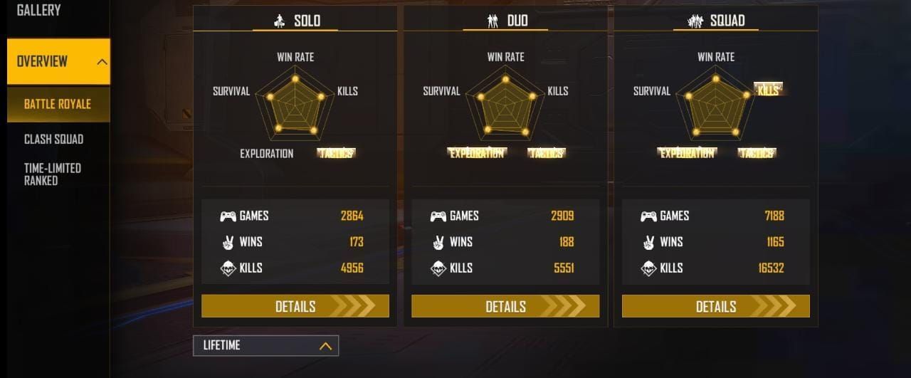 Helping Gamer ने गरेना फ्री फायर मैक्स में 7188 स्क्वाड मैच खेले हैं और उन्हें 1165 में जीत मिली हैं। इस दौरान उन्होंने 16532 किल्स किये हैं और उनका K/D 2.74 रेश्यो का है। इसके साथ ही उन्होंने डुओ मोड में 2909 मैच खेले हैं और उन्हें 188 में जीत मिली हैं। इसके साथ ही 5551 किल्स कर चुके हैं और उनका K/D 2.04 का है। उन्होंने सोलो मोड में 2864 मैचों में से में 173 जीत दर्ज की हुई है। इसके साथ ही उनका K/D 1.84 रेश्यो का है जबकि वो 4956 किल्स कर चुके हैं।