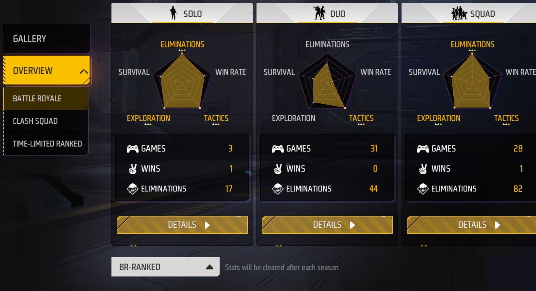 Helping Gamer ने फ्री फायर मैक्स में क्लैश स्क्वाड रैंक मोड में 28 स्क्वाड मैच खेले हैं और उन्हें 1 जीत मिली हैं। इस दौरान उन्होंने 82 किल्स किये हैं और उनका K/D रेश्यो 8.50 का है। इसके साथ ही उन्होंने डुओ मोड में 31 मैच खेलकर 44 किल्स किये हैं और उनका K/D रेश्यो 1.42 का है। इस खिलाड़ी ने सोलो मोड में 3 मैच खेले हैं और 1 में जीत हासिल की है। उन्होंने कुल 17 किल्स किये हैं और उनका K/D रेश्यो 3.04 का है।