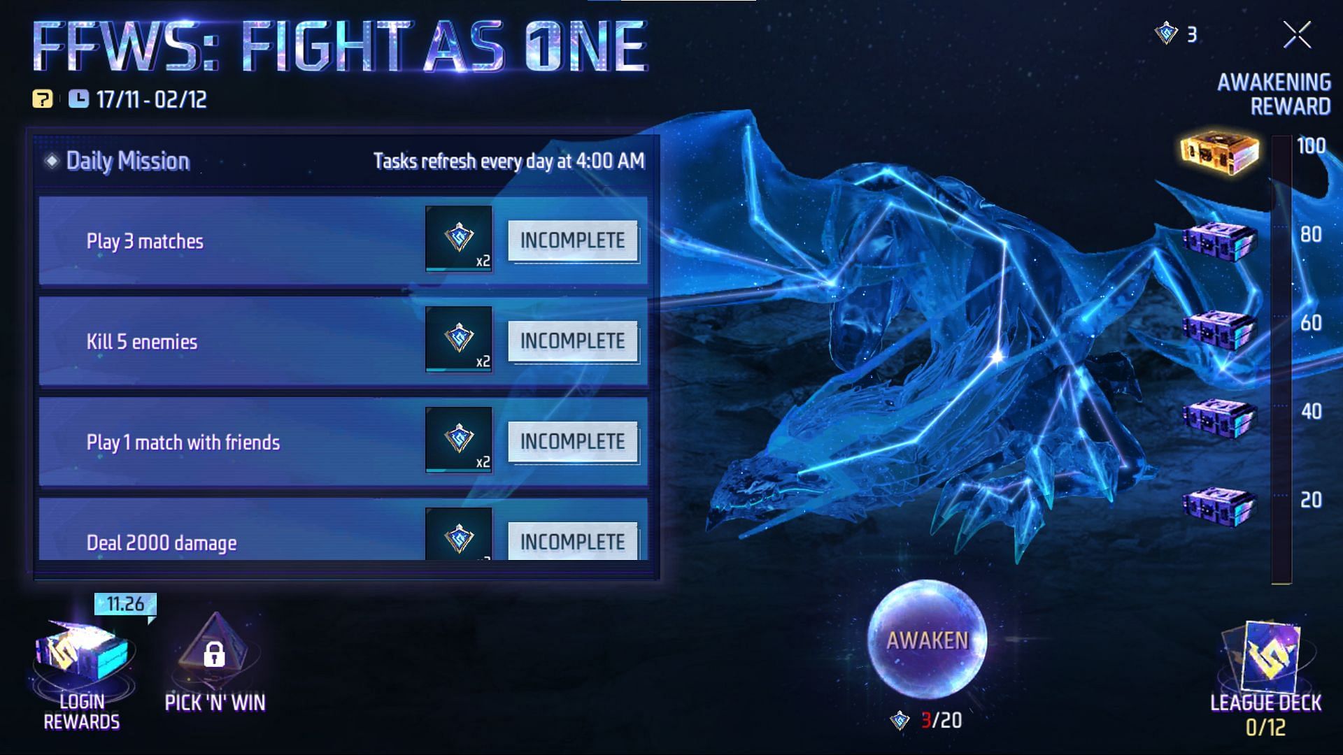 आप FFWS Shield टोकन्स को जोड़कर ड्रैगन जगा सकते हैं और हर अवेकनिंग पर इनाम मिलेगा। आपको हर बार अवेकनिंग और इनाम पाने के लिए 20 टोकन्स की जरूरत होगी। आपको इन मिशन्स को पूरा करना होगा: