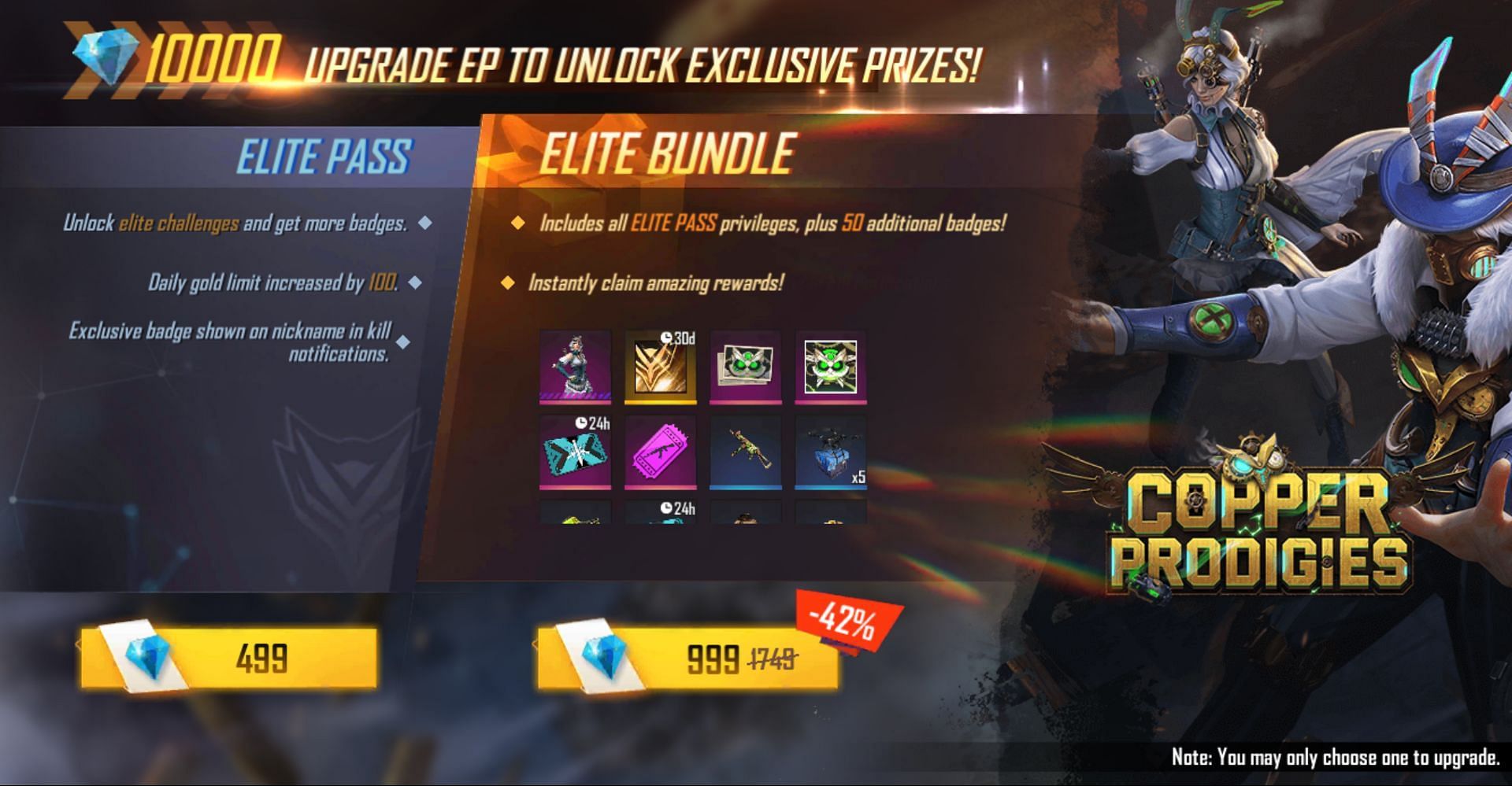 खिलाड़ियों के पास दो तरह के एलीट पास रहते हैं और वो किसी एक को खरीद सकते हैं। पहला एलीट पास 499 डायमंड्स का है वहीं एलीट बंडल की कीमत 999 डायमंड्स है। दोनों में थोड़ा अंतर है और आपको ज्यादा कीमत में ज्यादा इनाम मिलते हैं। .
