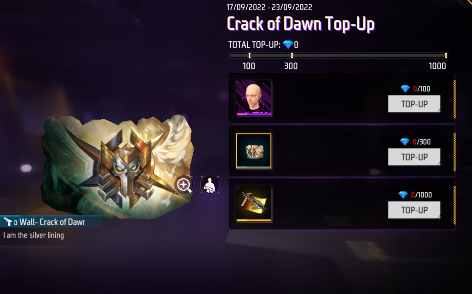 गेम के अंदर डेवेलपर ने टॉप-अप इवेंट में लेटेस्ट Crack of Dawn इवेंट को जोड़ा गया है। ये इवेंट 17 सितंबर 2022 को पेश हुआ था। इसके अलावा यह इवेंट 23 सितंबर 2022 तक मौजूद है। गेमर्स यहां पर मौजदू डायमंड्स के तोर पर आइटम को प्राप्त कर सकते है: