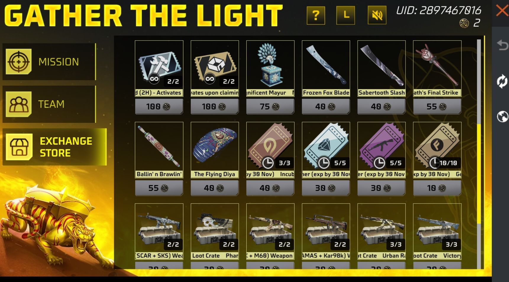प्लेयर्स ऊपर मौजदू आइटम को एक्सचेंज स्टोर से टोकन्स का उपयोग करके रिडीम कर सकते हैं। गेमर्स को टोकन्स हर दिन मिशन पुरे करने पर मिलते हैं और ये मिशन हर दिन रिसेट किए जाते हैं।