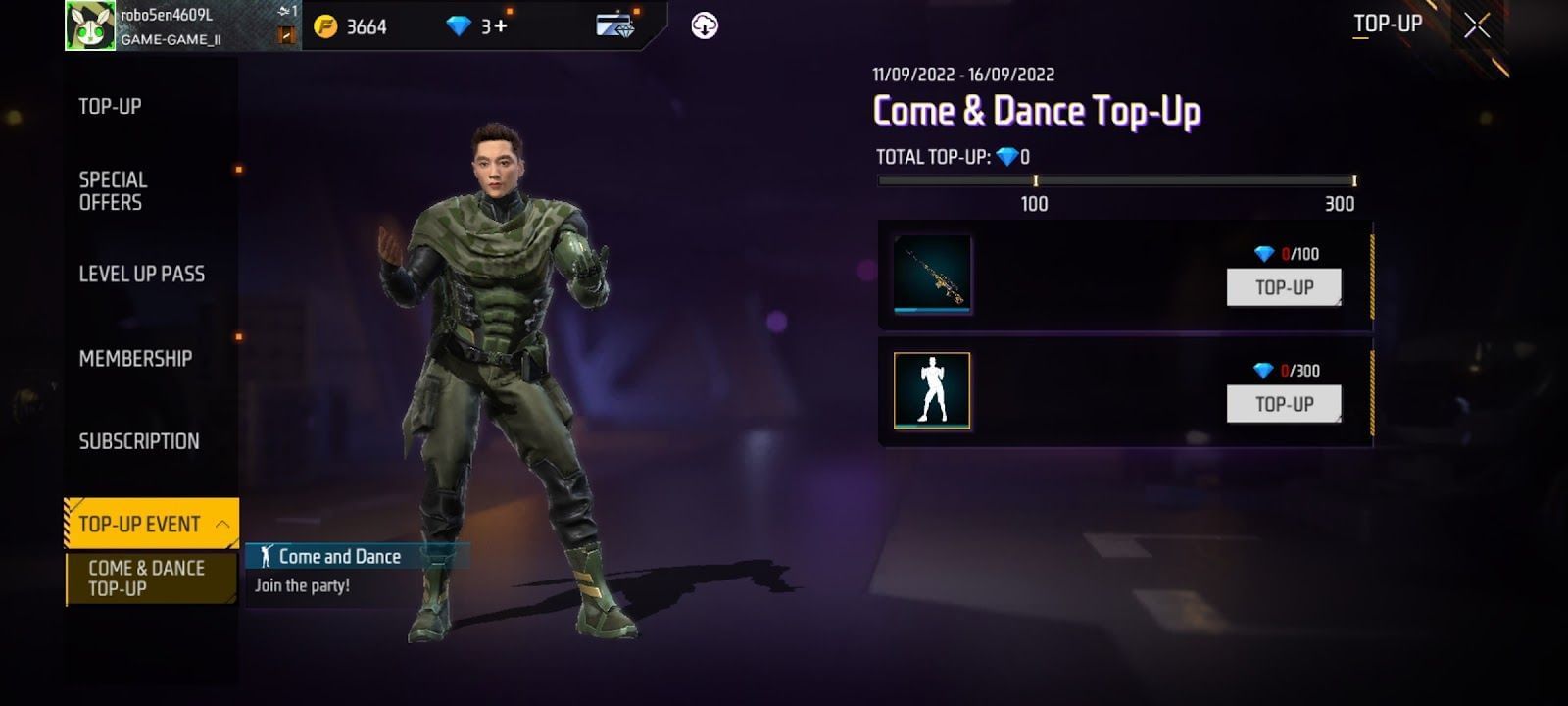 Come & Dance टॉप-अप इवेंट को Free Fire Max में डेवेलपर ने 11 सितंबर 2022 को जोड़ा था और ये इवेंट 16 सितंबर 2022 तक रनिंग पर रहने वाला है। गेमर्स इस इवेंट के मुताबिक डायमंड्स का टॉप-अप कर सकते हैं और इनाम को मुफ्त में प्राप्त कर सकते हैं